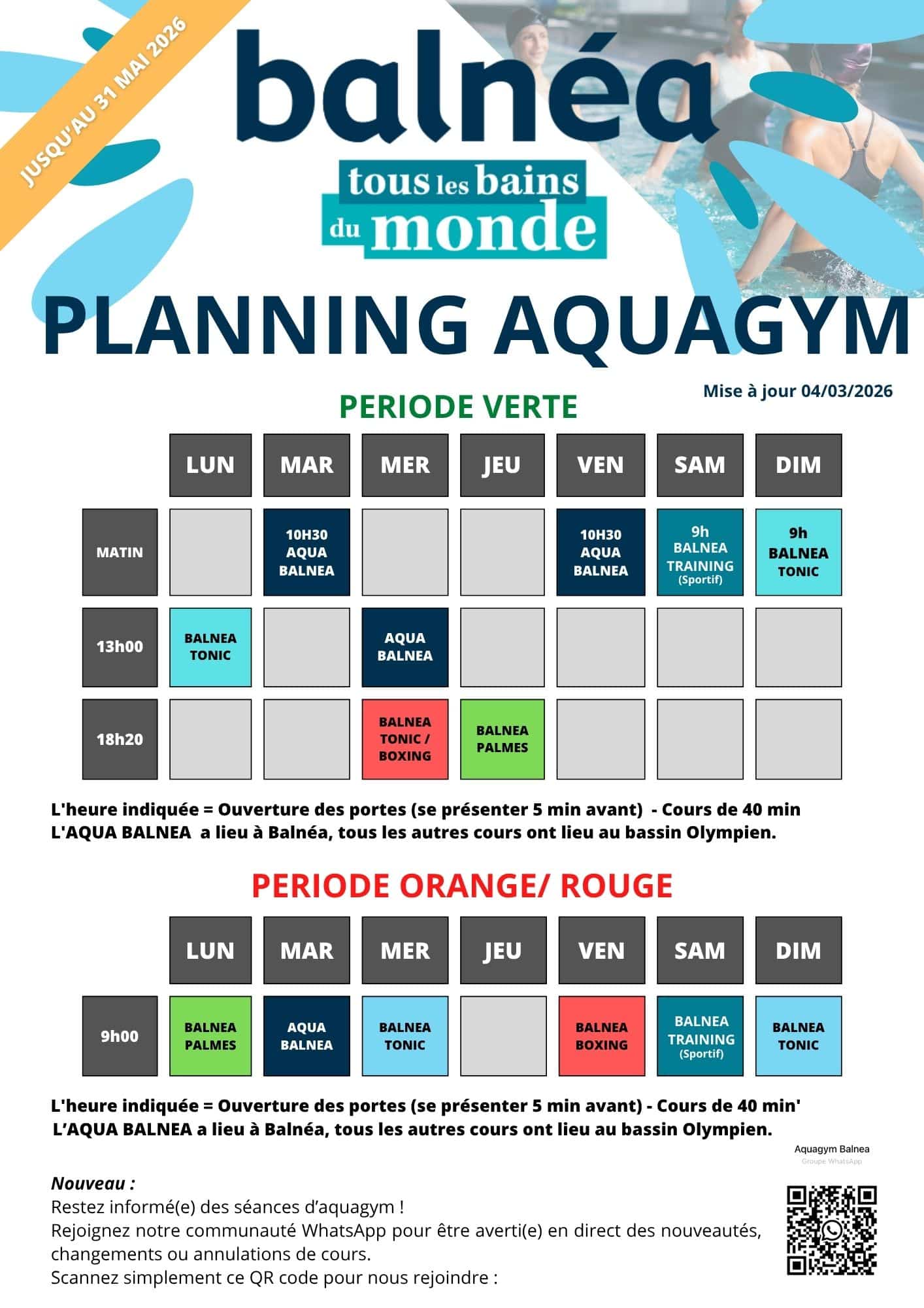 L’aquabalnéa a lieu à Balnéa, tous les autres cours ont lieu au bassin olympien.